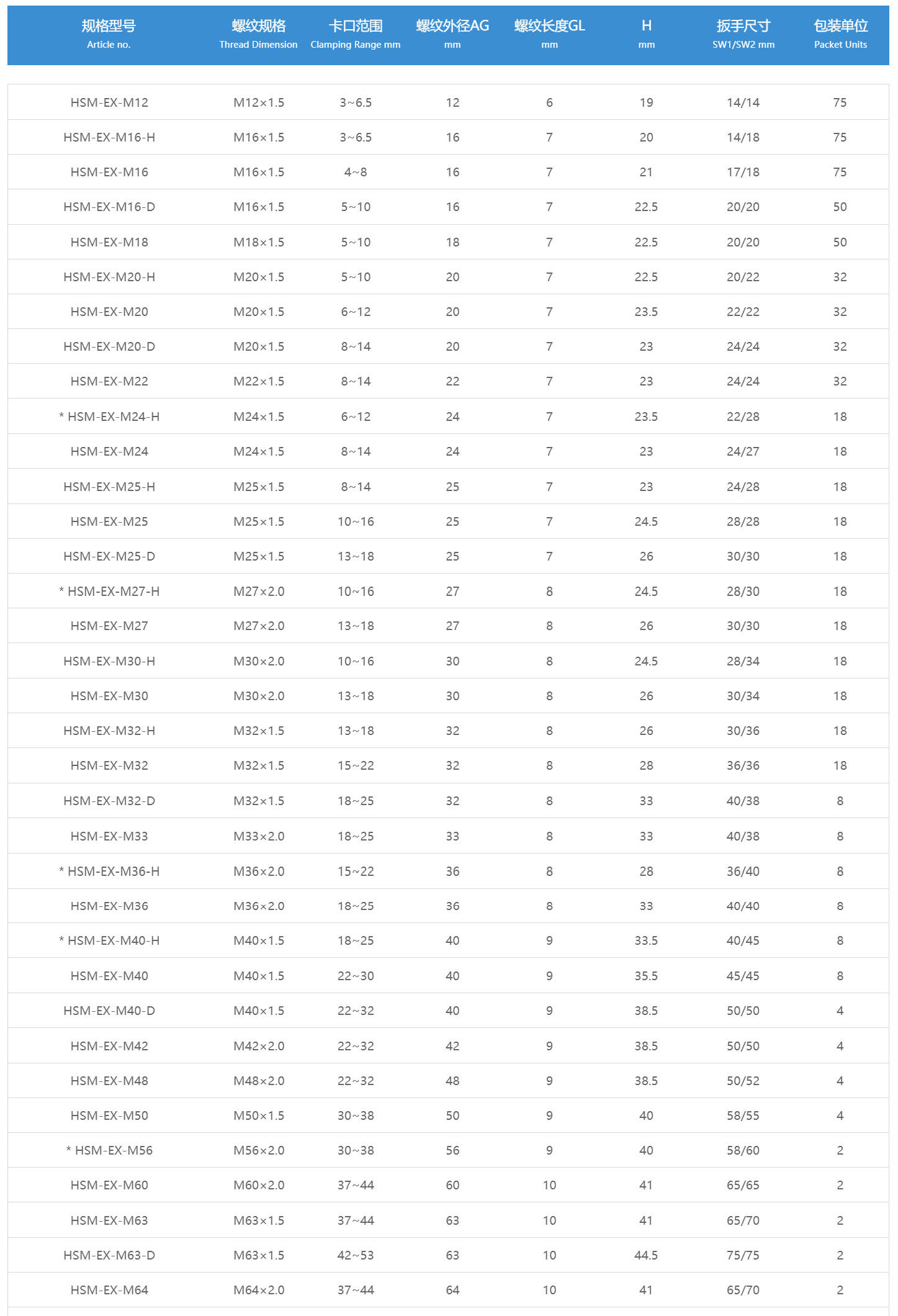 Rosca métrica HSM-EX-M Material: O metal externo é latão, niquelado e a manga do núcleo interno é náilon. O material de vedação é borracha modificada Temperatura: -40 ℃~100 ℃, curto prazo até 120 ℃ Nível de proteção: Dentro da faixa de ponto de verificação especificada, o nível de proteção pode atingir IP68